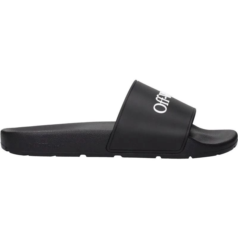Omschrijving: Het product met MPN OMIU002MAT0011001 en code F84958 van rubber in het zwart is een paar slippers en klompen ontworpen door Off-White. Het heeft kenmerken zoals een logo aan de voorkant.