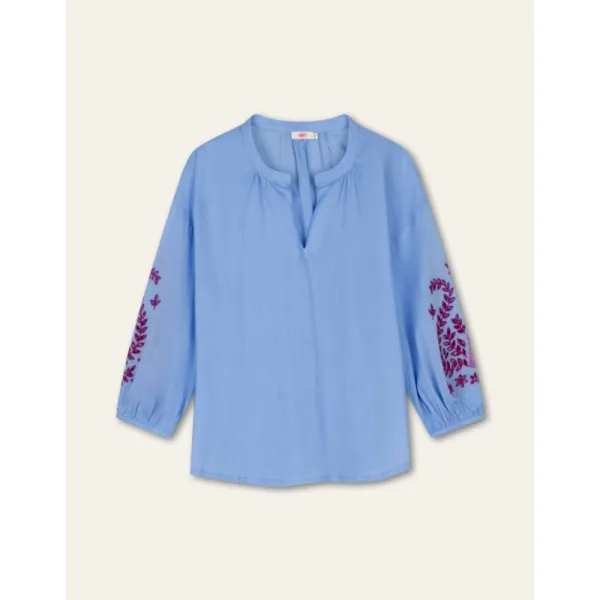 Heerlijk luchtige katoenen blouse met V-hals en 3/4 mouwen. De opengewerkte borduur in paars op de mouwen maakt het een echte zomerse blouse, luchtig en stijlvol. - 100% Katoen - Opengewerkt borduur op de mouwen - V-hals - 3/4 mouwen - Gemaakt in India