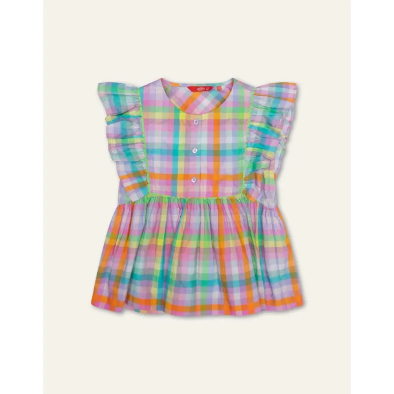 Dessin Candy Check is een ruit met felle en zoete kleuren. Het maakt van deze mouwloze blouse met ruches en schulpdetails een echte eyecatcher. - 100% Katoen - Gemaakt in India