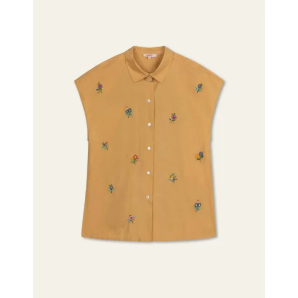 Deze met katoen geweven blouse heeft een mooie unikleur en geborduurde details van kralen met pailletten. De blouse staat wijd uit en heeft een rechte fit met kleine plooien achter en kapmouwen. Je sluit de blouse met parelmoeren knoopjes. - 100% Katoen - Gemaakt in India - Het model is 178cm en draagt maat 36