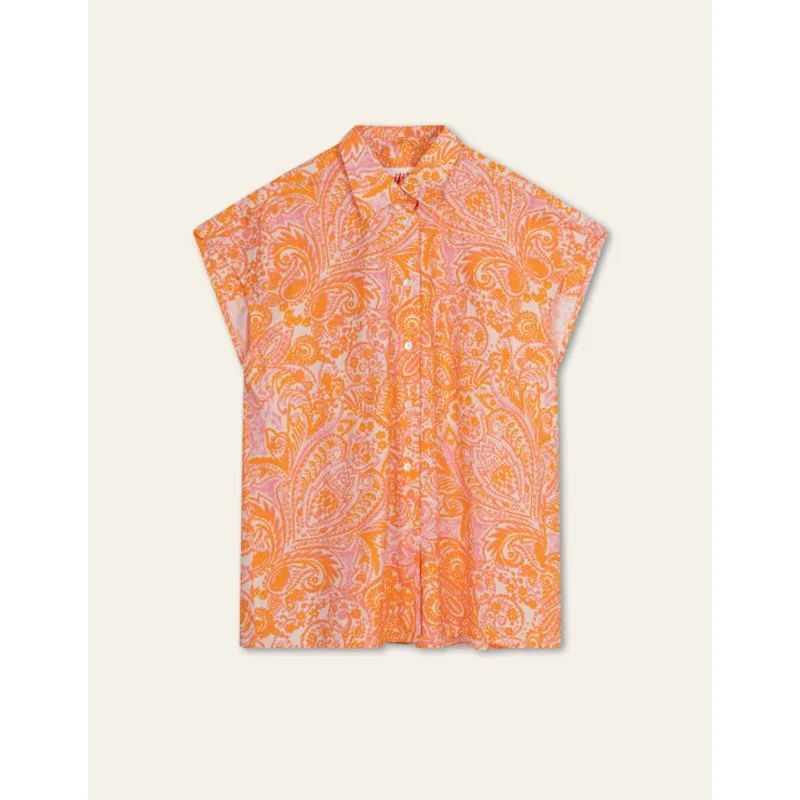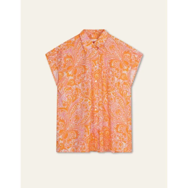 Deze met katoen geweven blouse met kapmouwen heeft de weelderige vormen van ons dessin Marker Paisley. De blouse staat wijd uit en heeft een rechte fit met kleine plooien achter. Je sluit de blouse met parelmoeren knoopjes. - 100% Katoen - Gemaakt in India - Het model is 180cm en draagt maat 36