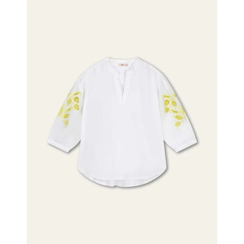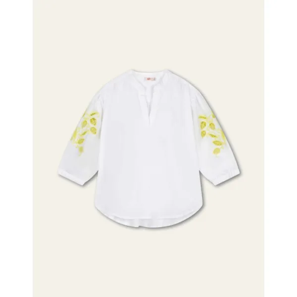 Luchtige blouse met een V-hals. De mouwen zijn afgewerkt met opengewerkt borduur in frisse lime tint — subtiel, zomers en verfijnd. - 100% Katoen - Opengewerkt borduur op de mouwen - V hals - Gemaakt in India