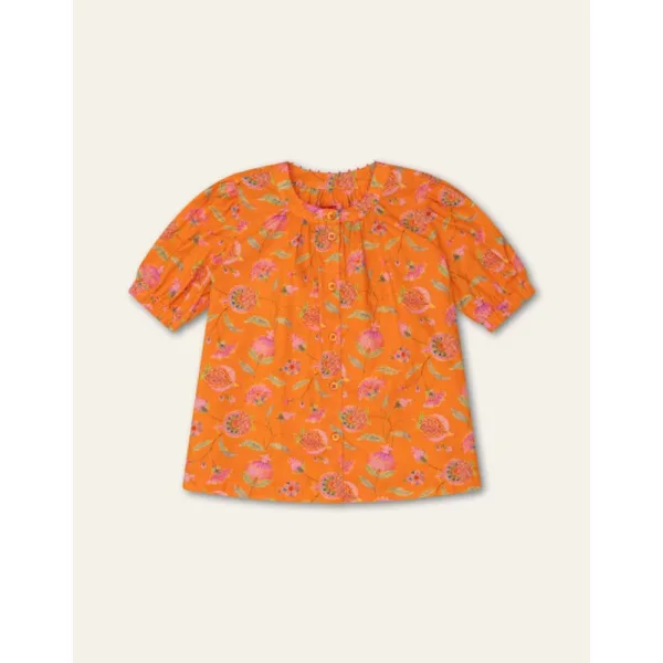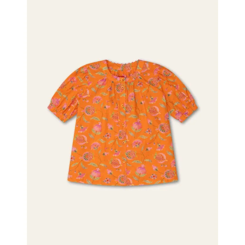 De granaatappel speelt in India een belangrijke rol bij rituelen, van bruiloften tot geboortes, en zie je vaak terug als decoratie. Deze betekenisvolle vrucht inspireerde onze prachtige print op dit zachte katoenen blousje, afgewerkt met French Knots. -100% Katoen -Afgewerkt met French Knots -Gemaakt in India