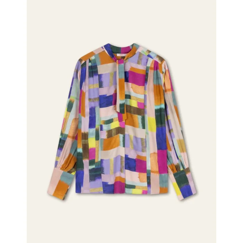 De blouse heeft een grafisch dessin gemaakt uit met stift getekende brede en smalle banen, over en naast elkaar. De viscose stof leent zich uitstekend voor de verlengde, elegante manchetten en striksluiting. Door de ademende eigenschappen blijft viscose ook bij warm weer luchtig en fris. - Regular fit - Gemaakt in Portugal - 100% Ecovero Viscose - Het model is 176cm en draagt maat 36