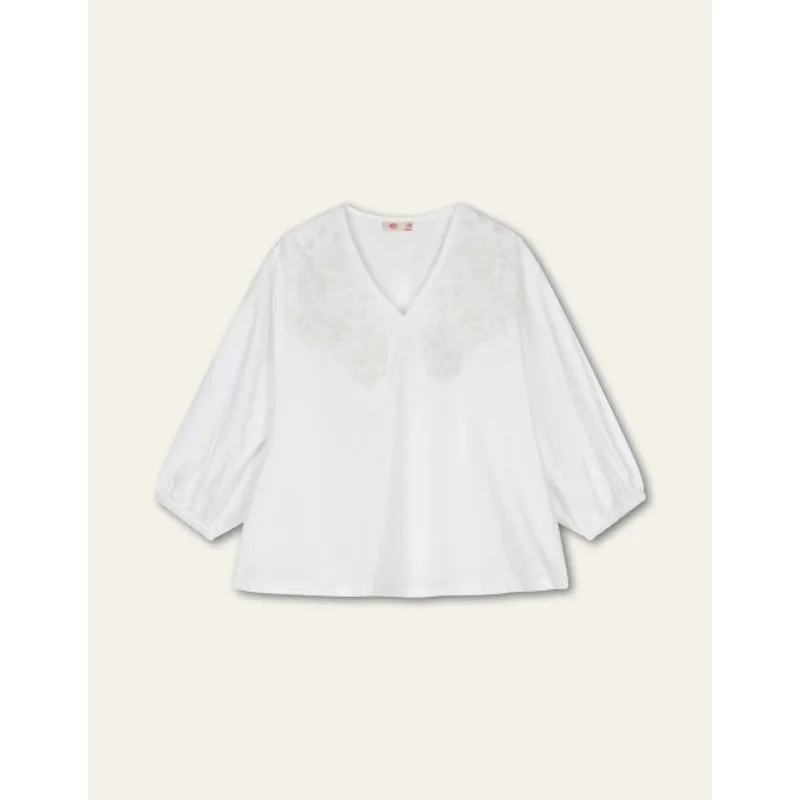 Kort model blouse met 3/4-mouwen en borduur langs de V-halslijn. De achterkant is gemaakt van zacht, comfortabel jersey-materiaal, voor een mooie combinatie van stijl en draagcomfort. - 100% Katoen - 3/4-mouwen - Borduur langs V-halslijn - Jersey achterkant - Comfortabel en stijlvol - Gemaakt in India