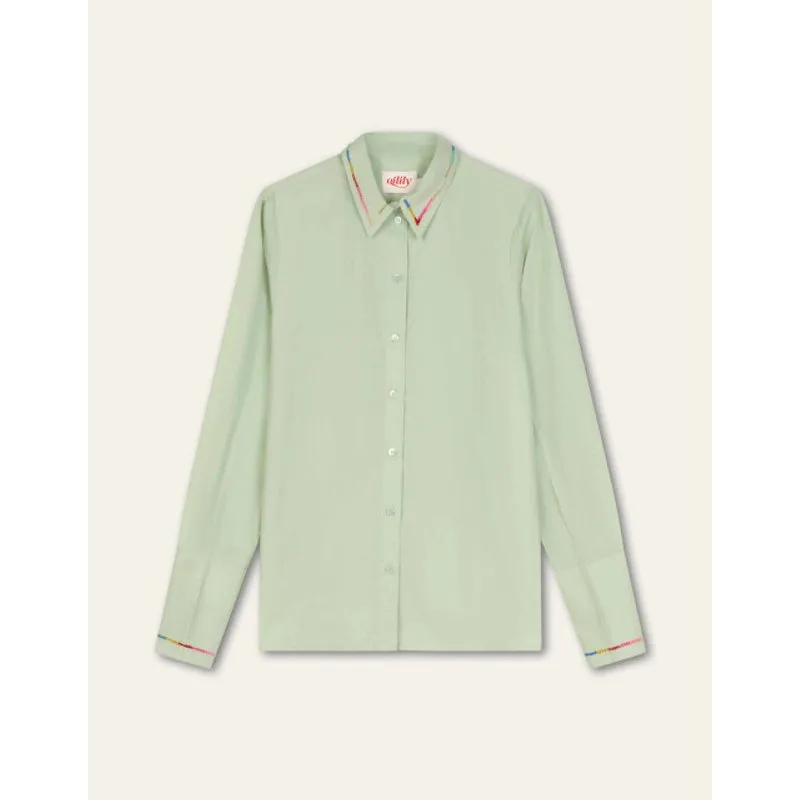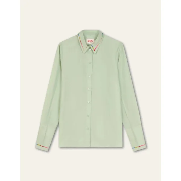 Smoked Green is de naam van de frisse kleur van deze getailleerde blouse. Je vindt prachtige geborduurde details op de puntkraag en lange manchetten met kleine splitten. -100% Katoen -Gemaakt in India