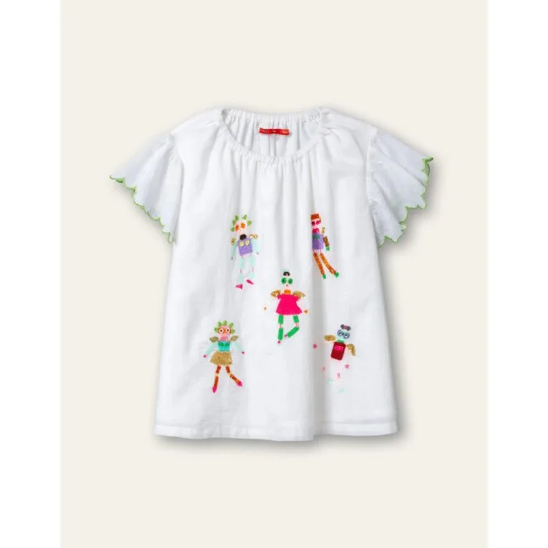 Houd je van dagdromen, luieren op een wolk, de hele dag suikerspinnen eten terwijl je bloemetjes plukt voor in je haar? Deze prachtige blouse is perfect voor dagdromertjes. Super zacht katoen, prachtige ronde vormen langs de zoom en met handgeborduurde robo-engeltjes gemaakt van kleurrijke, gouden en bronzen kralen.