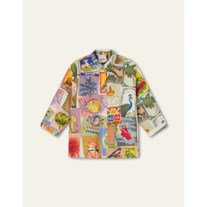 Luchtige boxy blouse met 3/4 mouwen en mother-of-pearl knoopjes. De print is geïnspireerd op Matchboxes uit India, waar alles kleurrijk wordt versierd – zelfs de kleinste doosjes! - 100% Linnen - 3/4 mouwen - Boxy fit - Mother of pearl knoopjes - Het model is 175cm en draagt maat 36 - Gemaakt in India