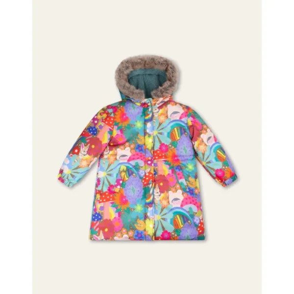 Het dessin Padded World creëerden we door een zachte wereld van ronde poppetjes met bloemen, gezichtjes, paddestoelen te tekenen. Het staat zo gezellig op deze teddy gevoerde winterjas met afneembare bontkraag. - Loose fit - Gemaakt in China - Recycled & Non recycled Polyester