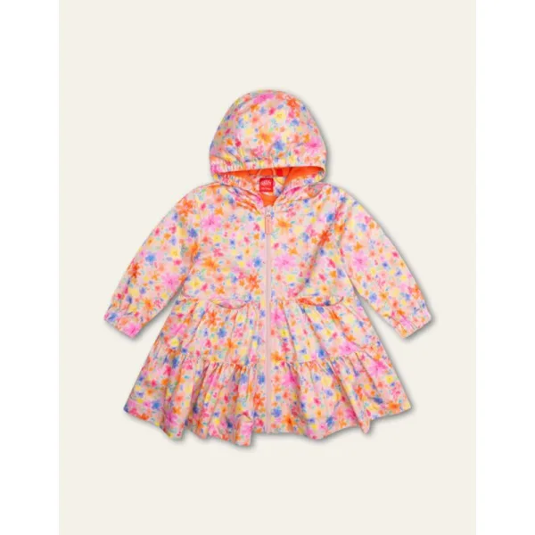 Deze digitaal getekende aquarel bloemen Watery Flowers geven deze jas iets sprookjesachtigs en komen mooi uit door het satijnkatoen. De stroken lopen wijd uit en het jasje heeft kleine zakjes, een capuchon, een terrytowel voering en sluit met een rits. - 75% Polyester, 25% Polyamide - Voering lijf 100% Katoen - Voering mouwen 100% Polyester - Ritssluiting - Gemaakt in China