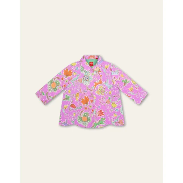 Dessin Oilily Vintage komt uit 1992 en we hebben het verfrist door stiften met waterverf te combineren. Het staat zoet op dit jasje met emaille smiley drukknoopjes, badstof voering, geschulpte kraag en zoom. - 100% Recycled Polyester - Voering lijf 100% Katoen - Voering mouwen 100% Polyester - Emaille knoopjes - Gemaakt in China