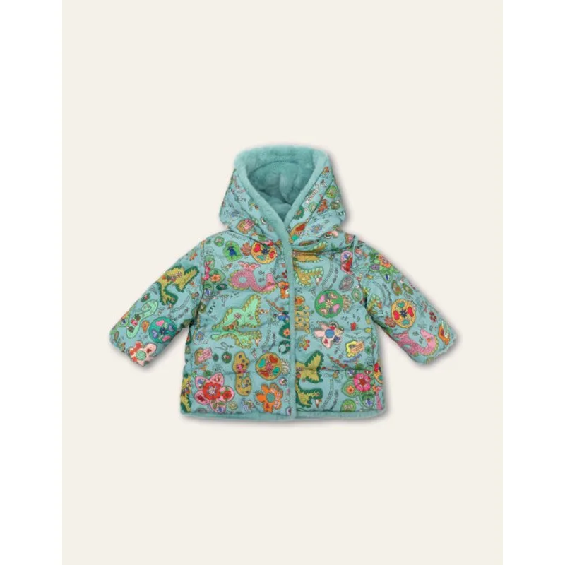 Deze heerlijke warme jas is dubbelzijdig te dragen, met fake fur aan één kant en de print Schokland Islands aan de andere kant. Dit dessin is een hommage aan het oud-Hollandse eiland in de Zuiderzee maar je vindt ook het Schotse monster Nessie terug tussen alle tekeningen. -Sluiting: Drukknopen -100% Recycled Polyester (buitenkant & vulling) -Gemaakt in China