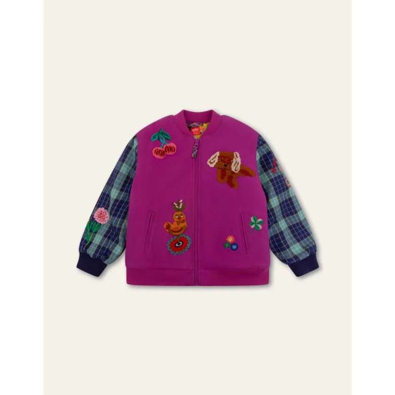 Deze bomber is geïnspireerd op een vintage Oilily bomber. In deze moderne uitvoering heeft de binnenkant het dessin Tide Spirits. Op de mouwen zie je de gezellige ruit Aaltje en overal verspreid vind je geborduurde, speelse dieren. De zipper-puller en het ophanglusje hebben een Schots ruitje. -100% Katoen (buitenkant) -100% Polyester (vulling & voering) -Gemaakt in India -Komt met Nathalie Lété ketting