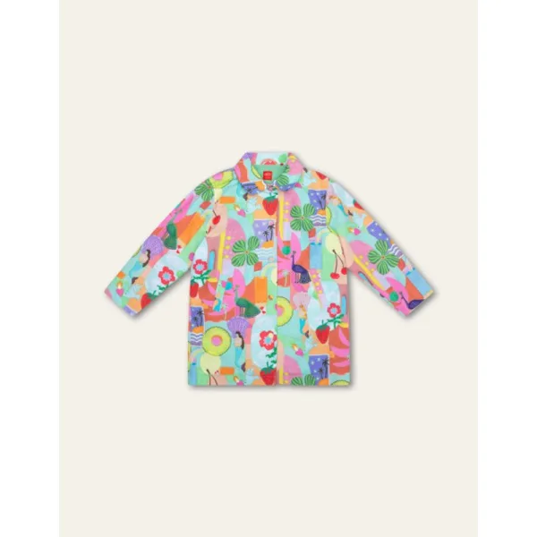 Dit met de hand getekende feestje van fruit en snoep vormt samen dessin Fiesta. Het is een vrolijk en kleurrijk geheel op deze heerlijke jas. We hebben de knoopjes ook in deze vrolijke stof bekleed, op de bovenste na. - 100% Recycled Polyester - Voering lijf 100% Katoen - Voering mouwen 100% Polyester - Gemaakt in China