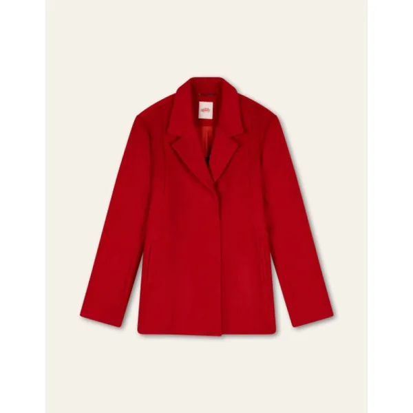 Mid-lange wollen jas met straight fit in statement rood en een split aan de achterkant. Deze heerlijke jas is gevoerd met de prachtige print Veerle met haar organische vormen in rijke kleuren. -50% Wol, 50% Polyester -Gemaakt in China