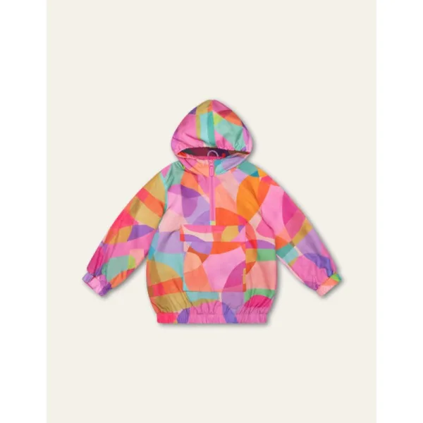 Dessin Sassy Circles kwam tot stand door gekleurde lagen van doorzichtig papier over elkaar heen te leggen. Het past vrolijk bij deze anorak met grote kangoeroezak en elastische capuchon. - 100% Polyester - Gemaakt in China