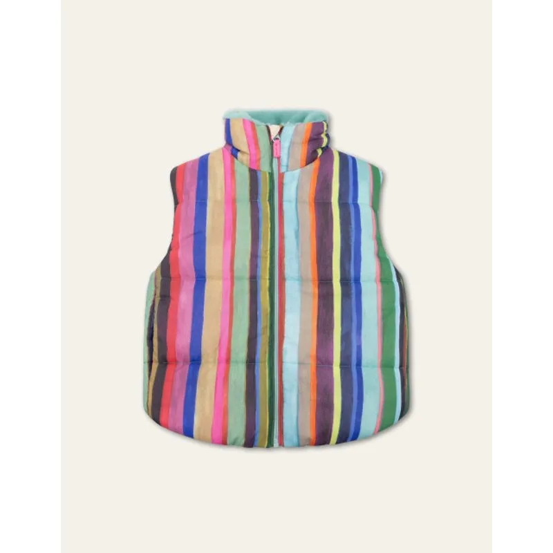 De Hollandse tulpenvelden gezien vanuit de lucht waren de inspiratie voor dit dessin. Met de hand schilderden we de strepen van print Pieternella. De kleuren staan mooi en passen ook goed bij de fake fur hoge kraag van deze stoere bodywarmer. -100% Polyester (buitenkant) -100% Recycled Polyester (vulling) -Gemaakt in China