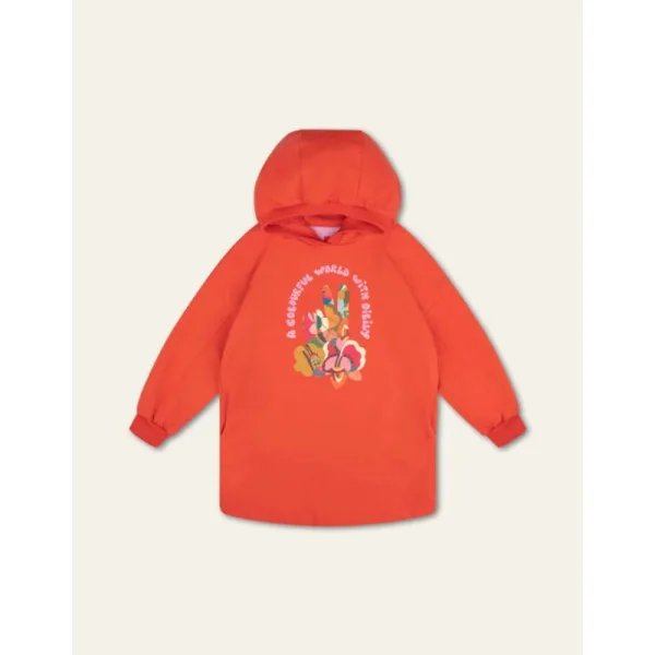 Vrolijkheid en comfort komen samen in deze lekkere sweaterdress in Oilily rood. De mouwen zijn lekker los, de capuchon prettig ruim en op je buik een prachtig kunstwerk vol kleuren. - Organisch Katoen - Loose fit - Gemaakt in Portugal