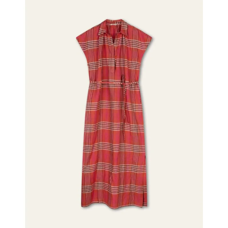 Deze luchtige enkellange jurk heeft zijzakken, een vrouwelijke V-hals met kraagje en één stijlvol knoopje. Met het tailleerkoord creëer je eenvoudig je favoriete silhouette. Het speelse kapmouwtje en de levendige Rang Mahal Check-print geven de jurk een frisse, zomerse uitstraling. - 100% Linnen - Los tailleerkoord - Kapmouwtjes - Het model is 177cm en draagt maat 36 - Gemaakt in India