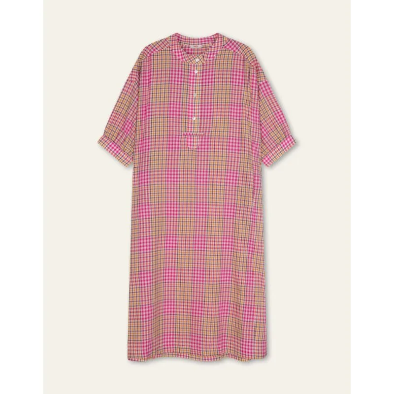 Het mooie van deze ruit, de Bliss Bay Check, is dat het heerlijk met de kleuren speelt. Het komt prachtig uit op deze losvallende zomerse jurk met ronde hals. - 100% Katoen - Gemaakt in India - Het model is 180cm en draagt maat 36