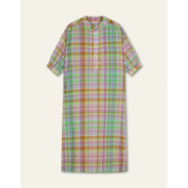 Het mooie van deze ruit, de Merry Meadow Check, is dat het heerlijk met de kleuren speelt. Het komt prachtig uit op deze losvallende zomerse jurk met ronde hals. - 100% Katoen - Gemaakt in India - Het model is 180cm en draagt maat 36