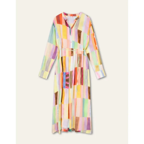 Deze maxi jurk is rijk aan volume en kleur. Castor is een dessin dat bestaat uit een collage van kleuren en vormen die samen een speels ritme creëren. Deze crêpe viscose jurk heeft zijzakken, een bijpassende dunne ceintuur, lieve dubbele knoopjes bij de manchetten en een subtiele V-hals. - 100% Ecovero Viscose - Loose fit - Gemaakt in Portugal