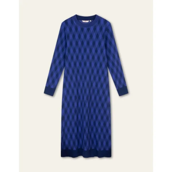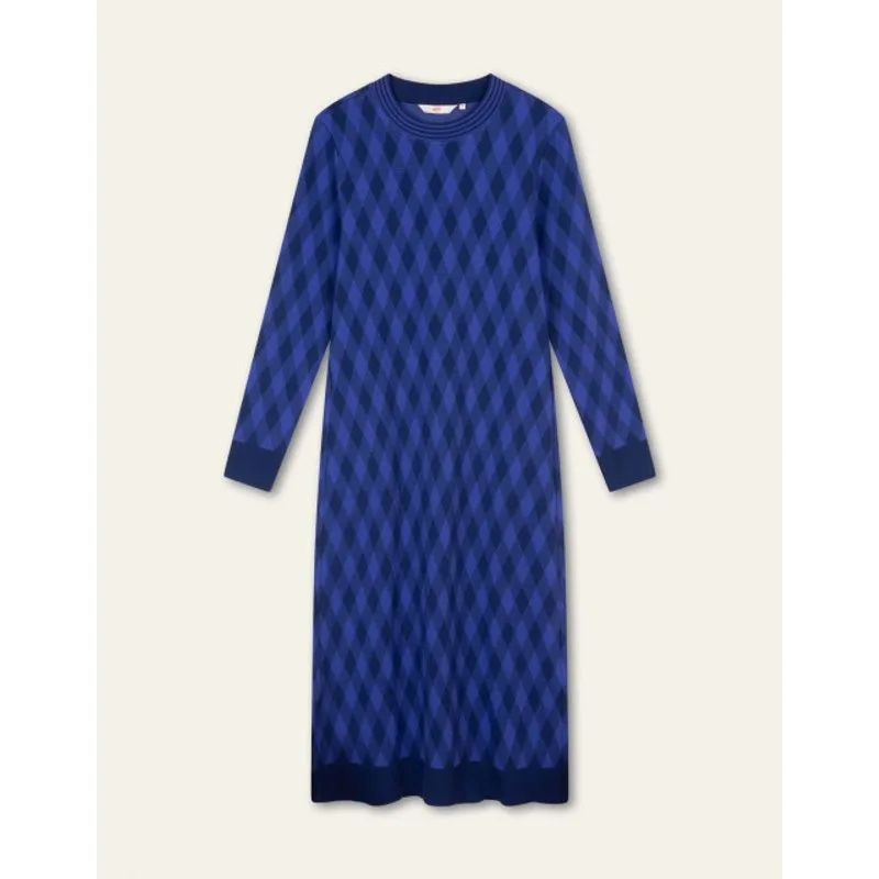 Jacquard gebreide midi-jurk in speels, diagonaal Edison Block dessin. De jurk heeft een straight fit. De boord is gestreept en bij de mouwen en onderkant kozen we voor een unikleur. - 90% Organic Katoen met Elastaan - Gemaakt in Portugal