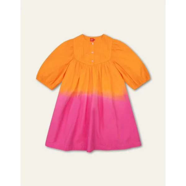 Deze jurk is in verf gedoopt, eerst in oranje, daarna in roze. Elke jurk is uniek, met vloeiende kleuren en een speels, tye-dye effect. -100% Katoen -Elke jurk is uniek -Gemaakt in India