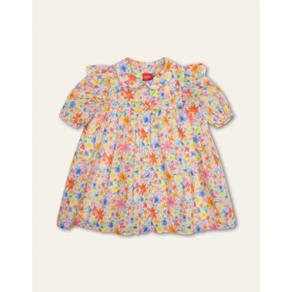 De digitaal getekende bloemen van dessin Watery Flowers stralen op dit lieve zomerjurkje. Met Peter Pan kraag, pofmouwen met extra ruches en heerlijk klokkend—een ware favoriet op zonnige dagen. - 100% Katoen - Gemaakt in India