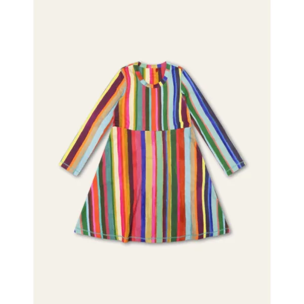 De Hollandse tulpenvelden gezien vanuit de lucht waren de inspiratie voor dit dessin. Met de hand schilderden we de strepen van print Pieternella. Een vrolijke stijl voor een vrolijke jurk. -93% Viscose, 7% Elastaan -Gemaakt in Noord-Macedonië