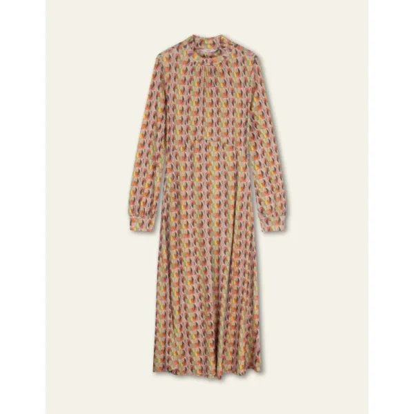 Grafische elementen van ons Fimoo dessin komen samen in warme kleuren op deze enkellange jurk met lage col gemaakt van tencel met brushed wol aan de binnenkant. Warm, uitnodigend en op en top vrouwelijk. - Regular fit - Gemaakt in Portugal - 70% Tencel, 30% Wol - Het model is 174cm en draagt maat 36