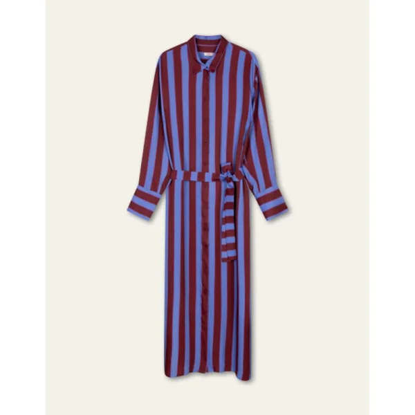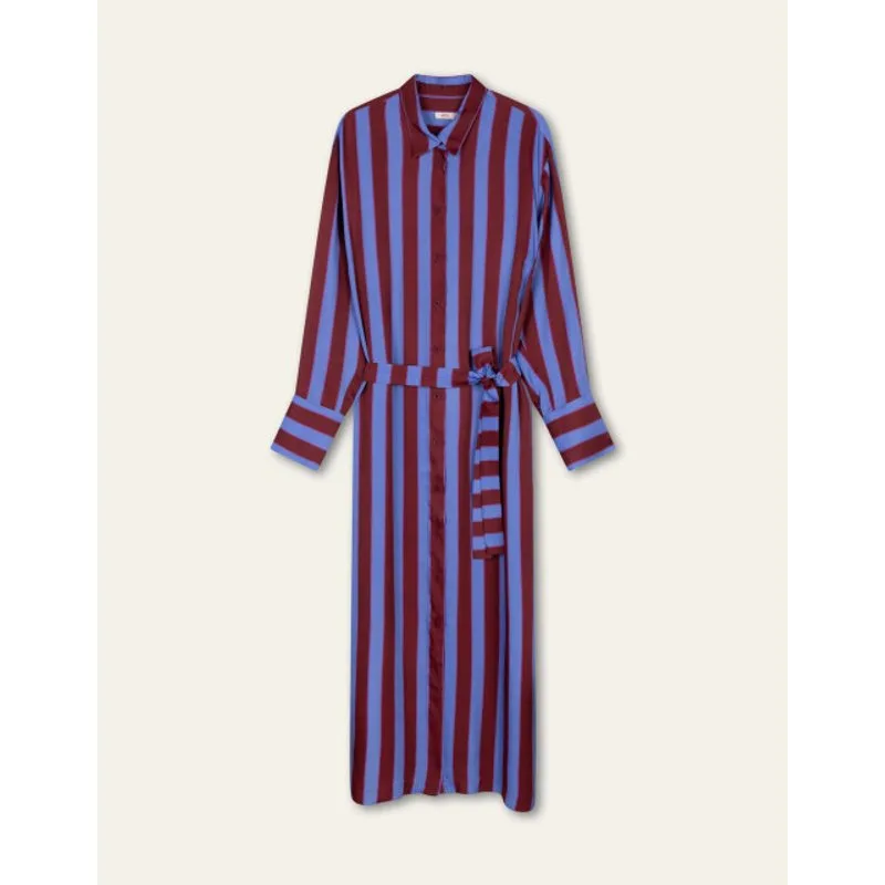 Midi doorknoopjurk met warme kleuren in het statement dessin Glenmour Stripe. Stijl de jurk zoals je wilt met de matching ceintuur. -58% Viscose, 42% Ecovero Viscose -Gemaakt in Portugal
