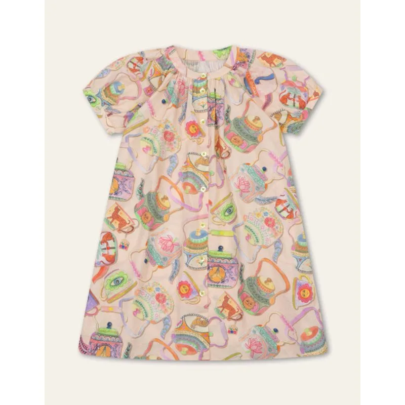 Geweven katoenen jurk met vrolijke Capchai-print, geïnspireerd op de Indiase theecultuur. Mother of pearl koopjes van boven tot onder. -100% katoen -Mother of pearl koopjes -Gemaakt in India