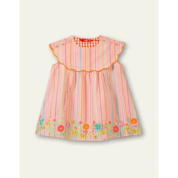 Zomers jurkje voor stralende meisjes. Dit lieve jurkje heeft yarn-dyed strepen en geborduurde bloemen in fluorkleuren. Speels, zoet en helemaal zomer-ready. - Katoen met polyester - Relaxed fit