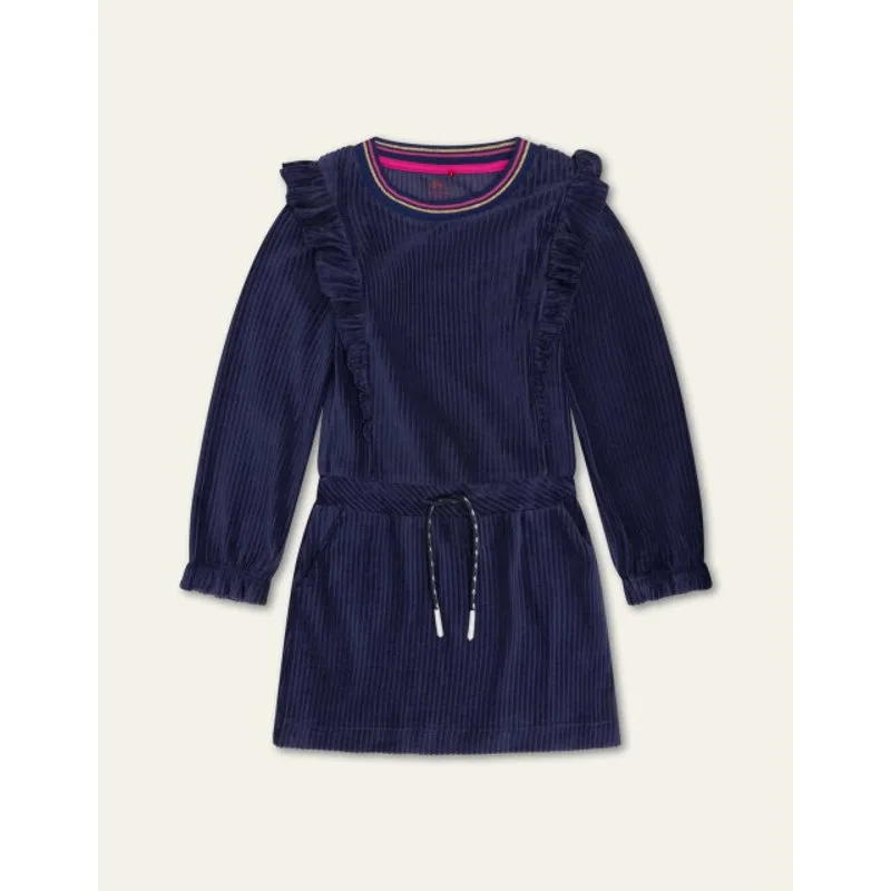 Zacht velours van organisch katoen is de basis van dit lieve jurkje. Het jurkje is makkelijk te dragen en heeft veel zoete, speelse details zoals de leuke ruches en het logo koord rond je middel. - Katoen met Polyester en Elastaan - Slim fit - Gemaakt in Noord-Macedonië