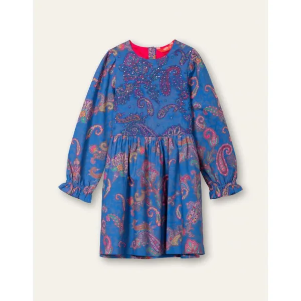 De detaillering op deze jurk is ongekend en werkelijk prachtig. Mogen we dat zelf zeggen? Ja, toch? De paisley in het lijfje springt nog meer in het oog doordat het met fijn borduurwerk en kleine kraaltjes is afgewerkt. De mouwen hebben kleine ruches, de schouders een lichte pof en de zakjes zijn subtiel verstopt. Zelfs de knoopjes aan de achterkant zijn bekleed in dezelfde stof. - 100% katoen - Knoopsluiting - Regular fit