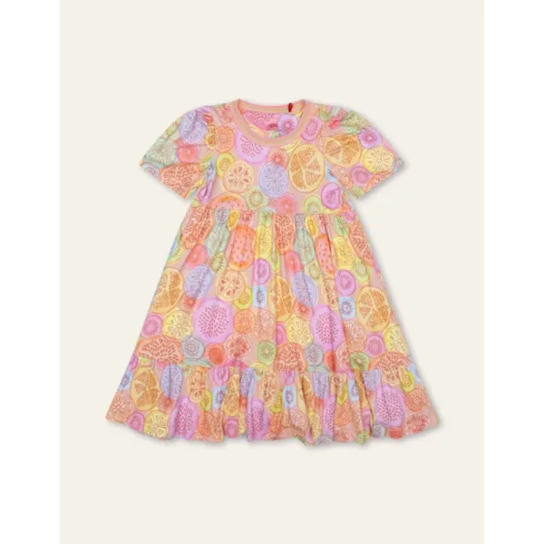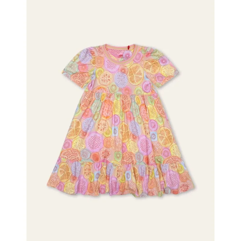 Fruit is altijd lekker maar misschien nog wel meer als de zon schijnt. Dessin Tutti Fruity laat allerlei heerlijk gesneden fruit zien in al hun rijke kleuren. Sappig en gezellig op dit vrolijke jurkje. - 93% Viscose, 7% Elastaan - Gemaakt in N-Macedonië