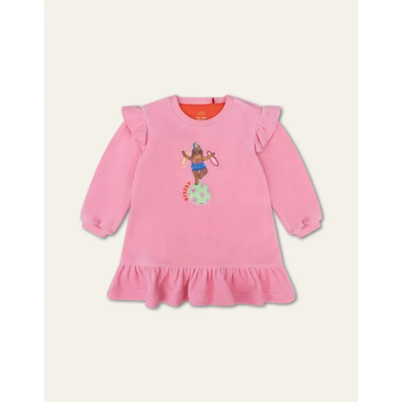Zacht velours van organisch katoen is de basis van dit lieve jurkje. Het jurkje is makkelijk te dragen en heeft veel zoete, speelse details zoals de leuke ruches. Maar wie doet daar nou trucjes op je buik? Dat is een echte circusartiest! - 100% Organisch Katoen - Slim fit - Gemaakt in Noord-Macedonië