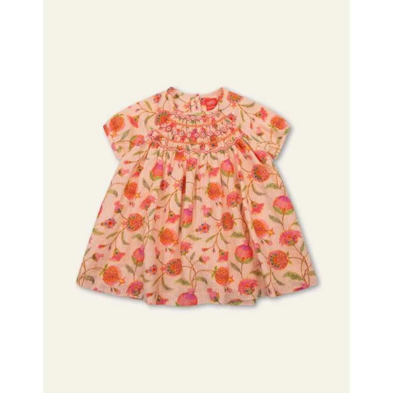 De granaatappel speelt in India een belangrijke rol bij rituelen, van bruiloften tot geboortes. Deze betekenisvolle vrucht inspireerde onze prachtige print op dit jurkje, met smockwerk voorop en knoopjes achter voor een lief detail. -100% Katoen -Smockwerk voorop -Knoopjes achter -Gemaakt in India