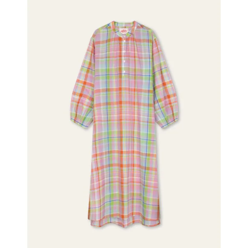 Het dessin Merry Meadow met ruitjes past perfect bij de losheid van deze maxi-jurk. De knoopjes van deze heerlijke jurk gaan tot de helft. De wijde fit met gathering bij de mouwen en langs de hals geven nog meer luchtigheid. - 100% Katoen - Gemaakt in India - Het model is 178cm en draagt maat 36