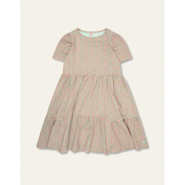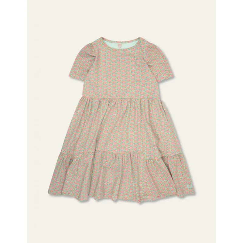 Fijne cirkels vormen de print van deze fijne zomerjurk. De combi van cool turkoois met warm oranje doet elk meisje stralen.