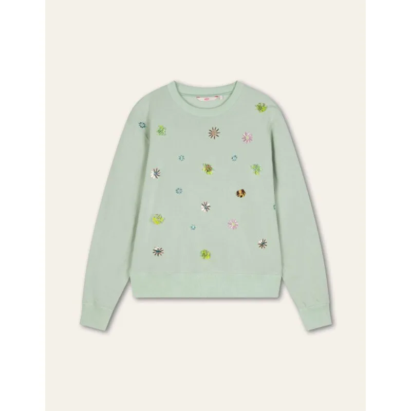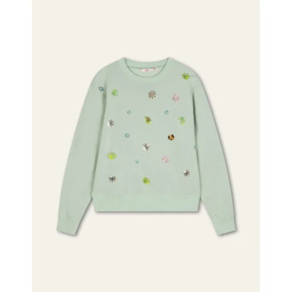 Wide fitted trui met speelse, geborduurde accenten met pailletten op een frisse, mintgroene kleur. Voor gezellige dagen binnen en ontspannen dagen buiten. -100% Katoen -Gemaakt in India