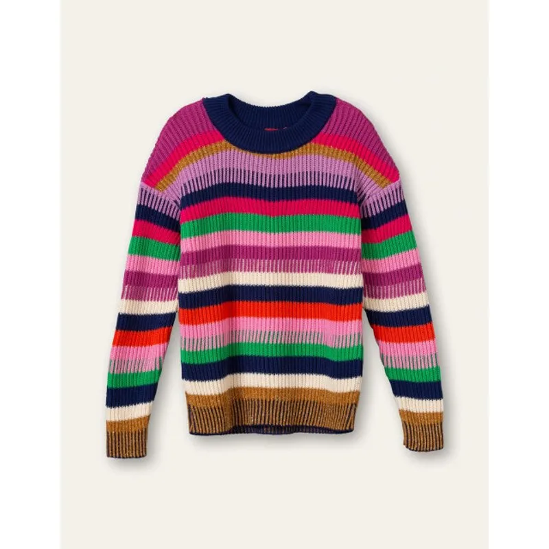 Een gebreide pullover met gezellige multi-coloured strepen. Voor een fijne, comfortabele look op dagen die wel wat glitter en kleur kunnen gebruiken. We raden aan om dit item niet in de kast op te hangen maar op een plank te leggen om het model mooi te houden. - Katoen met glitter - Regular fit - Gemaakt in Portugal