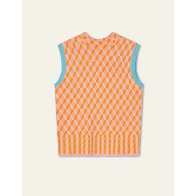 Deze jacquard gebreide, mouwloze top kan je dragen als laagje onder een vest of jasje, of als top. Het accent ligt op de schouders door de contrasterende kleur en patroon loopt door door bij de hoge hals. De onderkant heeft schulpjes. - 100% Organic GOTS Katoen - Gemaakt in China - Het model is 171cm en draagt maat 36