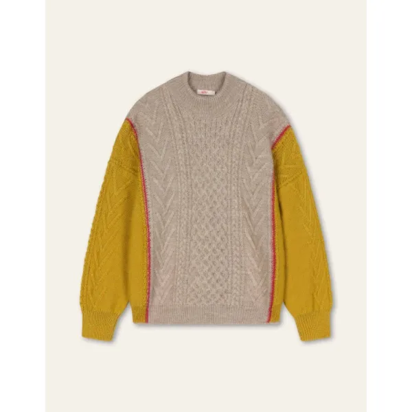 Rollneck trui met losse fit en gebreid in allerlei kabelpatronen. Een speels kleuraccent verdeelt de twee hoofdkleuren van elkaar. Wij raden aan dit item gevouwen in de kast te bewaren en niet op te hangen om de vorm te behouden. -70% RWS Certified Wool, 30% Alpaca -Gemaakt in Roemenië