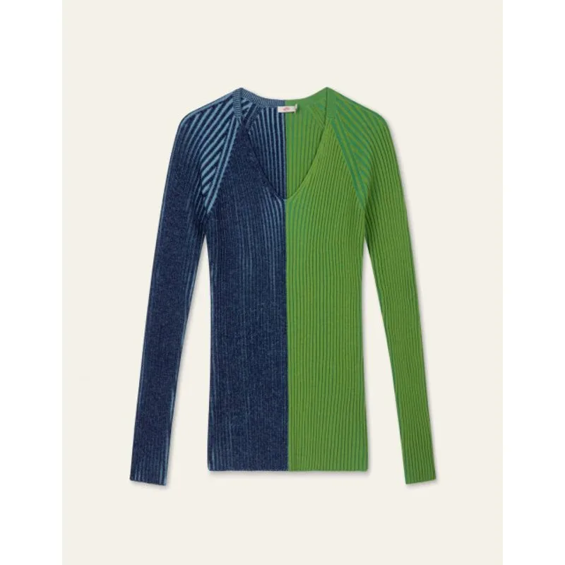 Voor een warme, fashionable look is deze body fitted top met V-hals perfect. Intarsia gebreid (naadloos) met Italian yarn in twee kleuren die je soms door elkaar heen ziet terwijl het op het eerste oog alleen een speelse, horizontale colourblock lijkt. De schouders zijn in vorm gebreid. - Garen gemaakt van RWS gecertificeerde wol en GOTS gecertificeerd katoen - Knitwear behoudt vorm en kwaliteit als je het liggend in je kast legt en niet op een hanger hangt - We raden ook aan om je knitwear zo min mogelijk te wassen maar te luchten