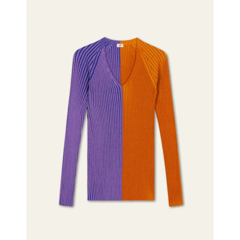 Voor een warme, fashionable look is deze body fitted top met V-hals perfect. Intarsia gebreid (naadloos) met Italian yarn in twee kleuren die je soms door elkaar heen ziet terwijl het op het eerste oog alleen een speelse, horizontale colourblock lijkt. De schouders zijn in vorm gebreid. - Garen gemaakt van RWS gecertificeerde wol en GOTS gecertificeerd katoen - Knitwear behoudt vorm en kwaliteit als je het liggend in je kast legt en niet op een hanger hangt - We raden ook aan om je knitwear zo min mogelijk te wassen maar te luchten