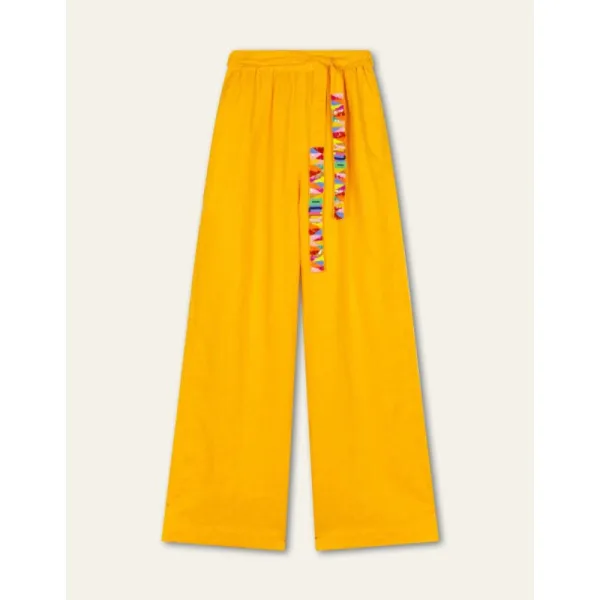 Bij de eerste zonnestralen wil je gewoon heerlijk luchtig linnen dragen. Zoals deze vrolijk losse, linnen broek met rechte pijp. De afneembare ceintuur heeft prachtige geborduurde kralen waarin je zelfs Oilily in kan lezen. - 100% Linnen - Loose fit - Borduurwerk is handcrafted in India