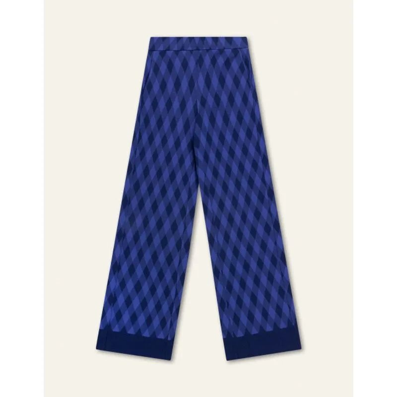 Deze winter kan je heerlijk flaneren in deze extra lange jacquard gebreide jersey broek met loose fit. De diagonale ruit staat speels en de straight fit voelt prettig en fijn. - Binnenbeenlengte 82 CM in maat S - 90% Organisch Katoen - Gemaakt in Portugal - Knitwear behoudt vorm en kwaliteit als je het liggend in je kast legt en niet op een hanger hangt - We raden ook aan om je knitwear zo min mogelijk te wassen maar te luchten