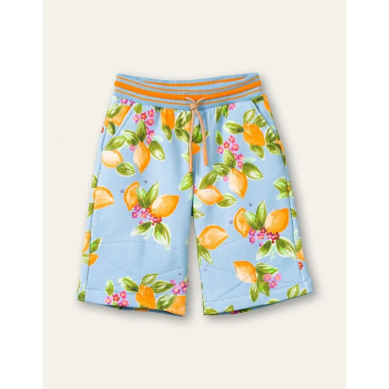 Vrolijke shorts voor zomerse dagen. Met oranje citroenen, groene blaadjes, paarse bloemetjes en een helderblauwe achtergrond. De elastische taille met drawstring is flexibel en de extra padding bij de knieën zorgt voor een stoer en stevig accent. - Relaxed fit - Organic Cotton - Elastische taille met drawstring - Extra laagje bij de knieën - Gemaakt in Griekenland